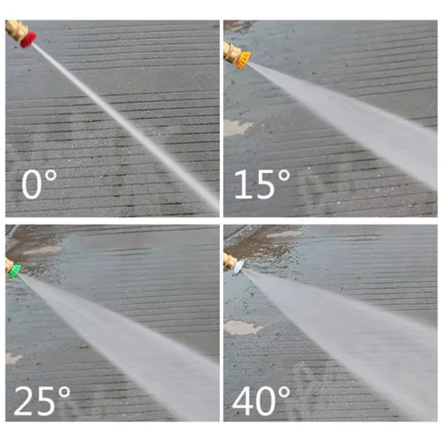 Nozzles are: 0deg ( Red ), 15deg ( Yellow ), 25deg ( Green ), 40deg ( White ) and 60deg ( Black ).